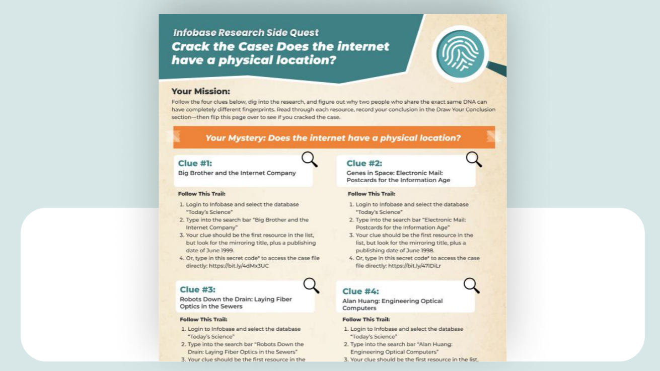 Four questions, four cases to crack. Each printable puts one mystery at the center, gives students four Infobase links to follow, and asks them to draw their own conclusions. Print them all and display them together, or roll one out each week.